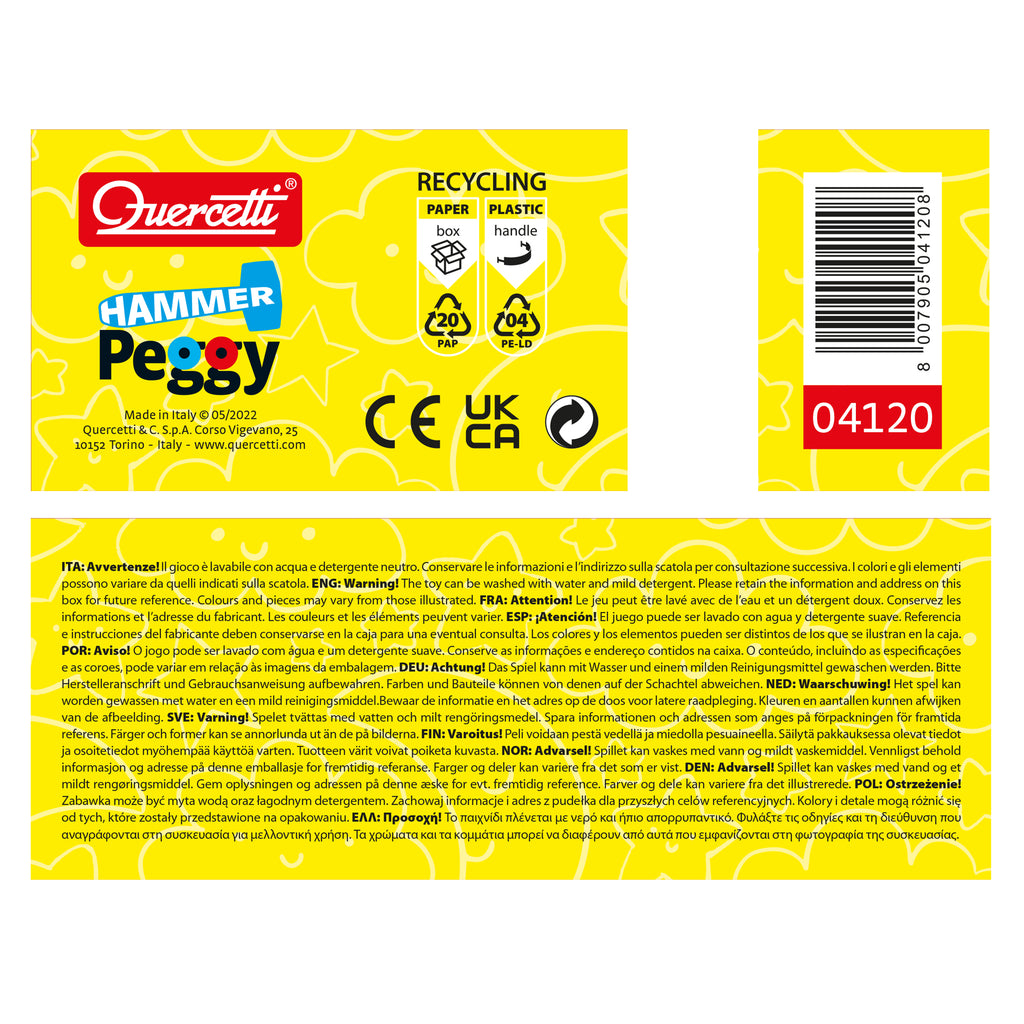 À l’aide d’un robuste marteau en plastique, l’enfant pourra frapper les plots colorés et s’exprimer en toute liberté. En utilisant juste un pied à la base du jouet, les plots toucheront la surface en dessous, sans tomber. L’enfant pourra alors renverser le jouet et tout recommencer. En revanche, en utilisant deux pieds superposés à la base du jouet, les plots frappés tomberont. L’enfant pourra ensuite les replacer dans les orifices et recommencer à les frapper.