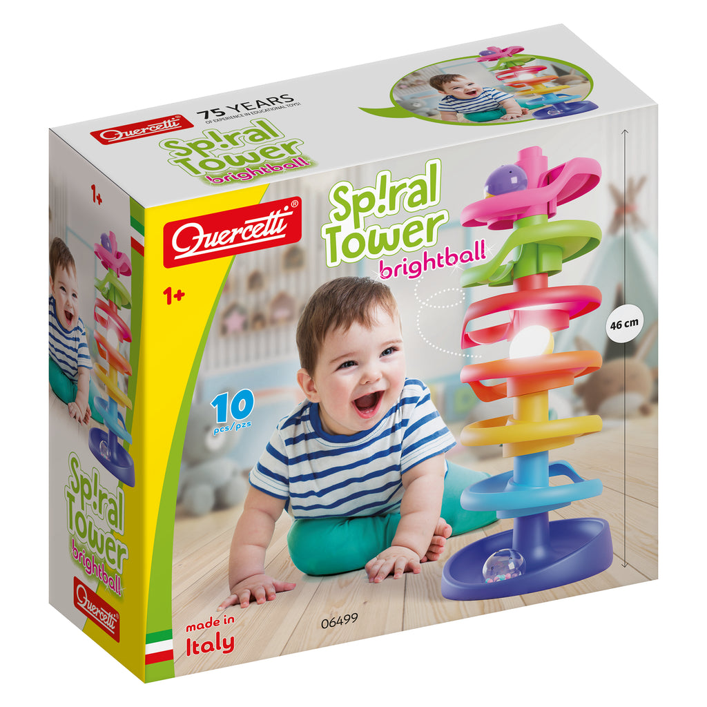 A tower made of many colourful elements with a large base to keep it all in firmly balanced. Colourful balls run down the spiral track and provide fun for all children. One of the balls has a light in it.